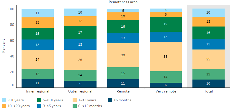 Figure 3.22.2: Proportion of GPs in rural and remote areas, by length of stay in current practice and remoteness, 30 November 2016