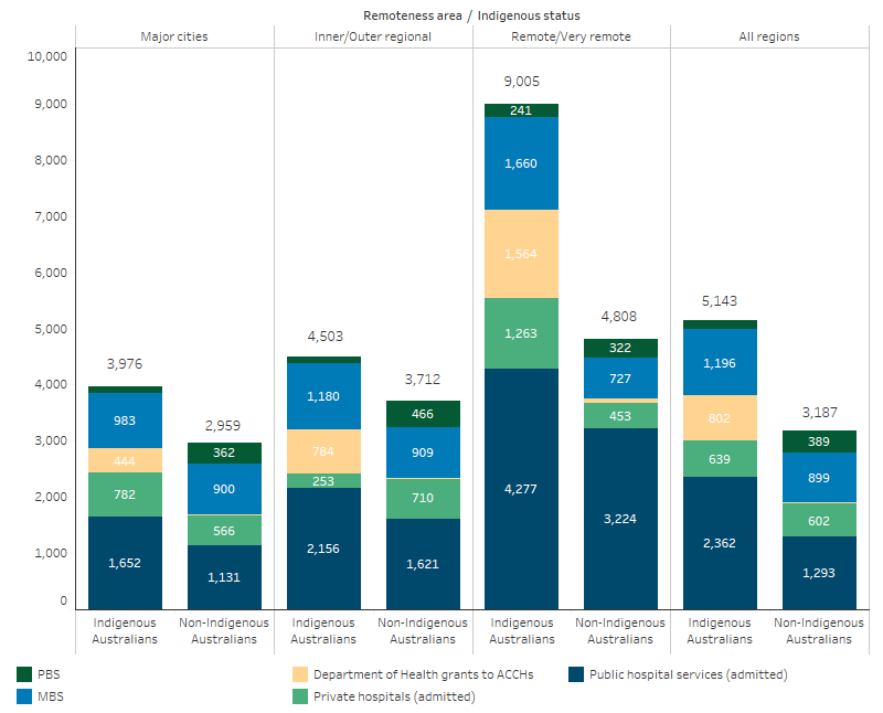 Note: Excludes health expenditure on non-admitted patient services, patient transport, dental services, community health services other than ACCHSs, other professional services, public health services, aids and appliances, research and health administration. In Remote and very remote areas the PBS total is inclusive of expenditure under the PBS s100 Remote Area Aboriginal Health Services (RAAHS) Program.